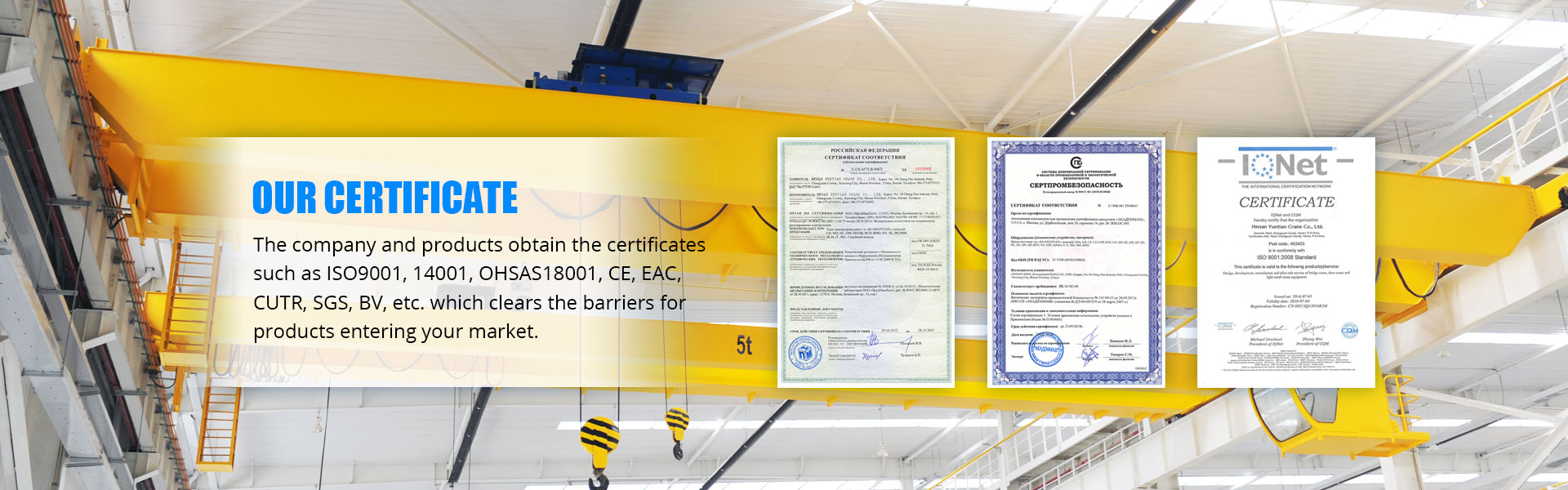 Mohli by sme Vám dodať všetky druhy priemyselných žeriavov od 0,25 tony do 900 t, prejsť GB / T 19001-2000 idt ISO 9001: 2000, GB / T 24001-2004 idt ISO 14001: 2004, GB / T 28001-2001, OHSAS 18001: 1999, CE, GOST, SGS, TUV, BV a tak ďalej.